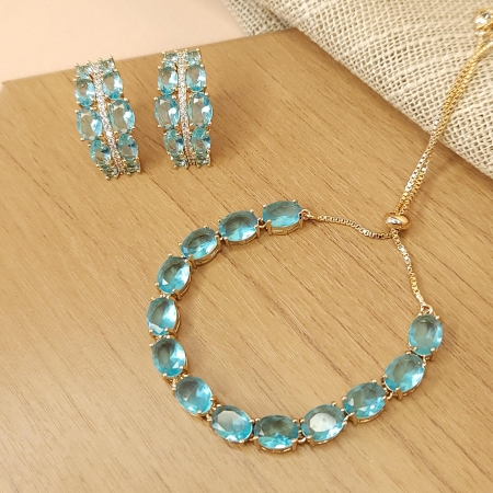 • Conjunto Pulseira Gravatinha e Brinco Pedras Fusion Azuis – Banhado a Ouro 18k