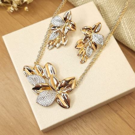 • Conjunto Elegante de Flores Cravejadas e Cordão – Banhado a Ouro 18k
