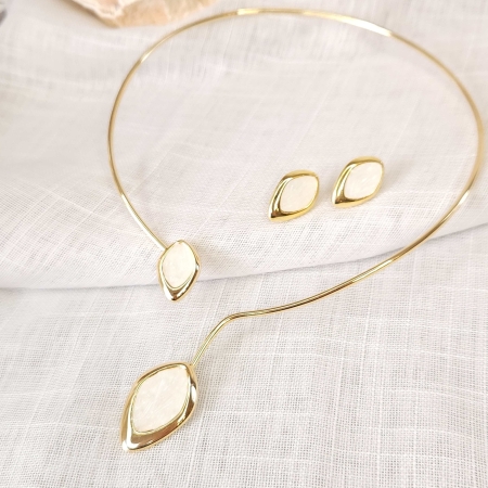 • Conjunto Elegante Pedras Naturais Navetes com Abalone/Nautilus – Banhado a Ouro 18k