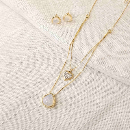 • Conjunto de Brinco Colar Duplo Coração Cravejado e Gota Pedra Natural Opalina – Banhado a Ouro 18k