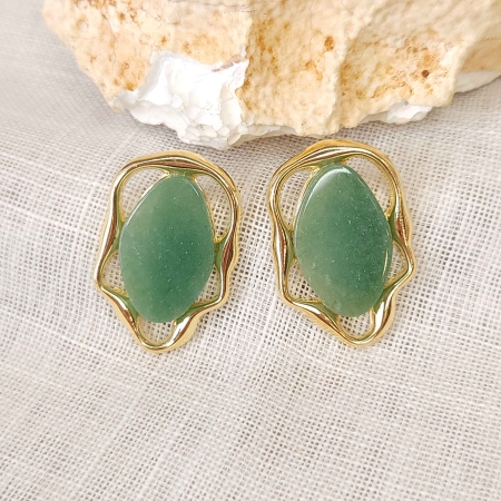 • Brinco Pedra Natural Quartzo Verde e Detalhes Ondulados – Banhado a Ouro 18k
