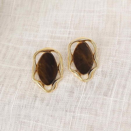 • Brinco Pedra Olho de Tigre com Detalhes Geométricos – Banhado a Ouro 18k