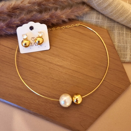 • Conjunto Colar fio Rígido com Pérola e Bola Lisa – Banhado a Ouro 18k