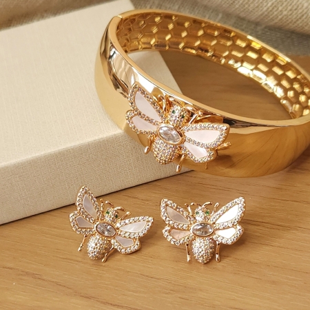 • Conjunto Bracelete liso e Brincos Abelha com Madrepérolas e zircônias – Banhado a Ouro 18K