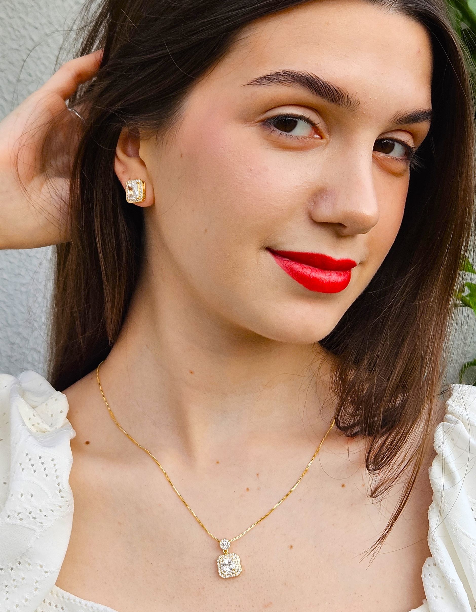 O Conjunto Cristais e Micro cravação de Zircônias é sinônimo de sofisticação e brilho impecável. Cada detalhe é cuidadosamente cravejado com micro zircônias, enquanto os cristais refletem luz com elegância. Banhado a ouro 18K, é uma semi joia versátil que eleva qualquer look, seja para o dia a dia ou ocasiões especiais.