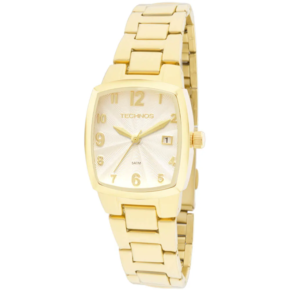 Relógio Technos feminino com caixa e pulseira de aço dourado. Um relógio clássico em caixa quadrada e mostrador em cor clara que dá o toque de sofisticação ao modelo.